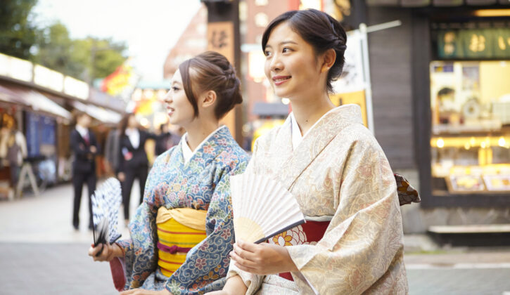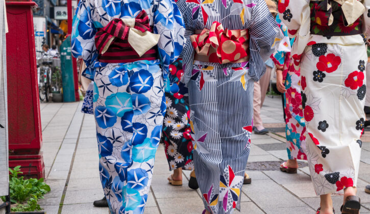 レンタル着物を着て、浅草観光はいかがでしょうか?男性用・女性用はもちろん、お子さん用も幅広いラインナップをご用意しております。浴衣を着て、仲良し女子会。色違いだと写真も素敵です!